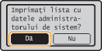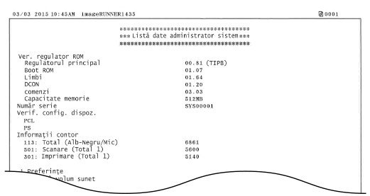 Lista de meniuri de setări) şi setările actuale înregistrate în aparat, precum dimensiunea şi tipul hârtiei.. Puteţi verifica şi informaţiile despre setări pentru <Setări reţea> şi <Setări administrare sistem> care nu sunt incluse în lista date utilizator (
