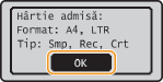 Verificaţi dacă dimensiunea şi tipul de hârtie afişate pe ecran sunt încărcate în aparat şi apăsaţi