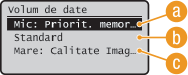 Puteţi specifica raportul de comprimare al fişierului care este aplicat când documentele sunt scanate în formatul de fişier specificat (Selectarea unui format de fişier). <Mic: Prioritate memorie> face raportul de compresie mai mare decât normal pentru a crea fişiere mai mici cu o calitate a imaginii mai mică. Pe de altă parte, <Mare: Prioritate calitate imagine> face raportul de compresie mai mic decât normal pentru a crea fişiere mai mari cu o calitate mai mare a imaginii.