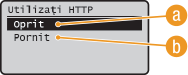 HTTP este folosit pentru comunicare prin intermediul reţelelor, aşa cum se întâmplă când accesaţi aparatul prin intermediul IU de la distanţă. Dacă folosiţi conexiunea USB sau nu folosiţi HTTP, puteţi dezactiva HTTP pentru a bloca comunicarea programelor terţe prin intermediul portului HTTP care nu este folosit.
