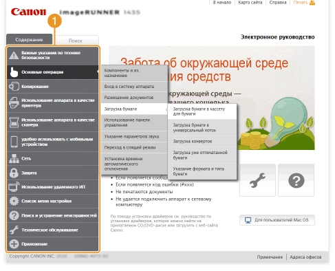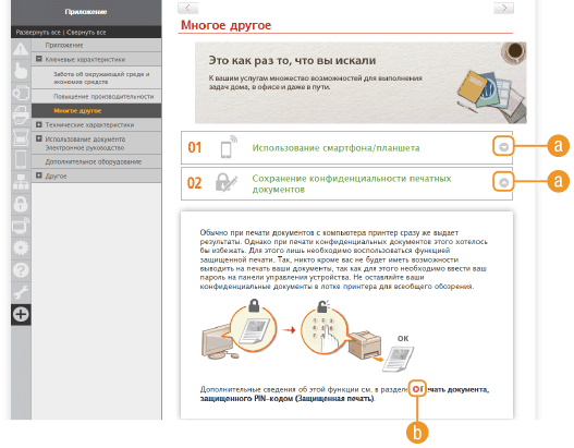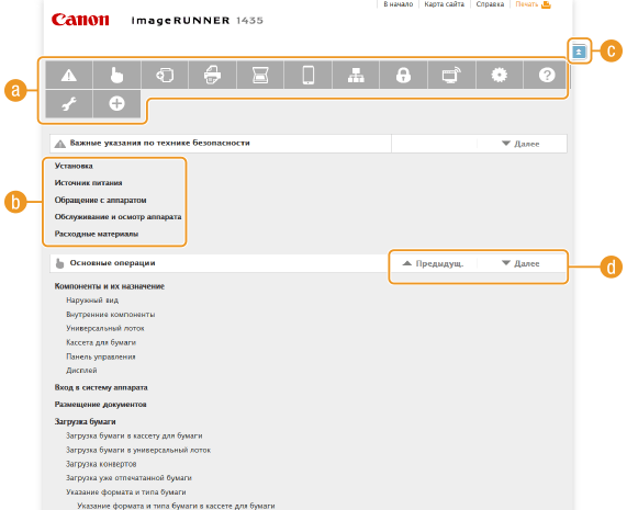 Электронное руководство пользователя разделено на экраны с различным содержимым.