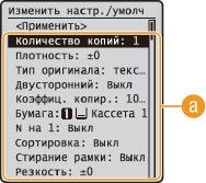 <Настройки копирования> <Изменить настройки по умолчанию> Выберите элемент настройки Измените значение по умолчанию для выбранного элемента <Применить>