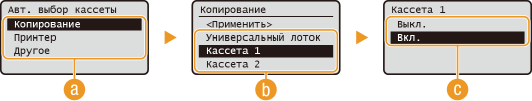 Выберите <Вкл.>, чтобы включить автоматический выбор кассеты для источника бумаги, выбранного на предыдущем экране (
