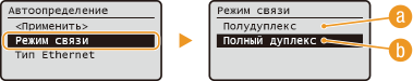 Данные связи попеременно отправляются и принимаются. Выберите этот режим, если аппарат подключен к сетевому устройству с использованием полудуплексной связи.