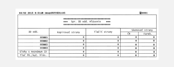 Keď je aktivovaná správa ID oddelení, môžete vytlačiť hlásenie a skontrolovať celkové počty skopírovaných, vytlačených a naskenovaných strán pre jednotlivé ID oddelenia. Hlásenie vám umožní sledovať používanie a vylepšiť správu.