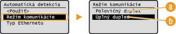 vyberte <Polovičný duplex> alebo <Úplný duplex> .![]() <Polovičný duplex>Striedavo odosiela a prijíma dáta komunikácie. Vyberte, keď je stroj pripojený k sieťovému zariadeniu pomocou polovičného duplexu.