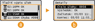 .![]() <Tlačiť výpis úloh>Zobrazí zoznam dokumentov, ktoré boli vytlačené. Po úspešnom vytlačení dokumentu sa zobrazí <OK> a keď sa nepodarí vytlačiť dokument kvôli jeho zrušeniu alebo chybe, zobrazí sa <Chyba>.