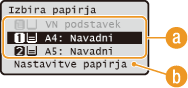 Uporabite za nastavitev velikosti in vrste papirja, vloženega v kaseti za papir. Nastavitve papirja za papir, ki ga pogosto vlagate v večnamenski podstavek, lahko tudi registrirate.