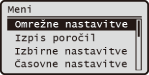, se odpre zaslon <Meni>. Na tem zaslonu lahko izbirate splošne nastavitve stroja, na primer <Skupne nastavitve> ali <Časovne nastavitve>, kot tudi številne nastavitve za posamezno funkcijo, na primer kopiranje in skeniranje.