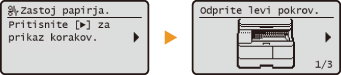 Pri nekaterih vrstah napak se prikažejo navodila za odpravljanje napake. Težavo odpravite po navodilih na zaslonu. Spodaj je kot primer prikazan zaslon, ki se prikaže v primeru zastoja papirja (