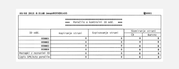 Če je omogočena funkcija Kontrolna ID, lahko za vsako ID oddelka izpišete poročilo o skupnem številu kopiranih, izpisanih in skeniranih strani. Poročilo omogoča nadzor uporabe in izboljšanje uporabe stroja.