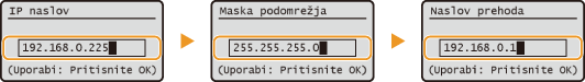 <Maska podomrežja> <Naslov prehoda>.Na vsakem zaslonu s številskimi tipkami vnesite nastavitev in pritisnite