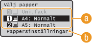 (Välj papper/inställningar) för att välja det papper som du vill använda på skärmen <Välj papper>. Du kan också trycka på knappen för att ändra pappersinställningar när du fyller på papper av ett annat format eller av en annan typ än det som tidigare fyllts på. Pappersinställningen måste vara rätt så att papperet matas in ordentligt.