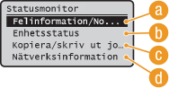 (Statusövervakare) visas en skärm som du använder för att kontrollera status för dokument som skrivs ut. Du kan även kontrollera statusen för enheten, t.ex. tonernivån eller nätverksinställningar, exempelvis enhetens IP-adress.