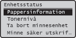 Visar enhetens status, t.ex. mängd papper och toner som återstår.