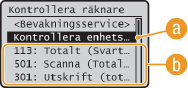(Räknarkontroll) visas skärmen <Kontrollera räknare>. Därifrån kan du visa räknarvärden och kontrollera enhetens serienummer och konfiguration.