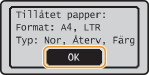 Kontrollera att det format och den typ av papper som visas på skärmen har fyllts på i enheten och tryck på