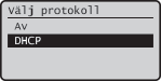 Välj <Av>. Om du väljer <DHCP> när DHCP-tjänsten inte är tillgänglig, kontrollerar enheten om tjänsterna levereras i nätverket, vilket leder till onödig kommunikation.