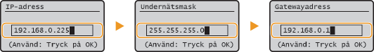 Ange inställningarna i följande ordning: <IP-adress>  <Delnätsmask>  <Gatewayadress>.