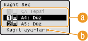 > ekranında kullanmak istediğiniz kağıdı seçmek için Kağıt Seçimi/Ayarlar (Kağıt Seç) seçeneğine basın. Ayrıca, önceden yüklenen kağıt boyutundan ve türünden farklı bir kağıt boyutu veya türü yüklediğinizde kağıt ayarlarını değiştirmek için bu tuşa basabilirsiniz. Kağıdın düzgün şekilde beslenmesi için, kağıt ayarının düzgün şekilde belirtilmesi gerektiğini unutmayın.