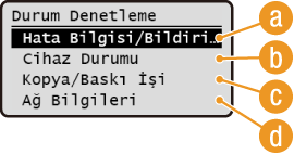 (Durum Denetleme) seçeneğine bastığınızda, yazdırılan belgelerin durumunu kontrol etmenizi sağlayan bir ekran görüntülenir. Ayrıca, toner seviyesi veya makinenin IP adresi gibi ağ ayarı bilgileri gibi makinenin durumunu kontrol edebilirsiniz.