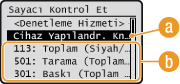 (Sayaç Kontrolü) seçeneğine bastığınızda, <Sayacı Kontrol Et> ekranı görüntülenir. Bu ekrandan, sayaç değerlerini ve aynı zamanda makinenin seri numarasını ve makine yapılandırmasını görüntüleyebilirsiniz.