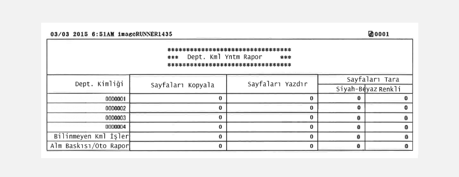 Departman Kimliği Yönetimi etkinleştirildiğinde, her bir Departman Kimliği için kopyalanan, yazdırılan ve taranan toplam sayfa sayısını kontrol etmek için bir rapor yazdırabilirsiniz. Rapor kullanımı denetlemenizi ve yönetimi geliştirmenizi sağlar.