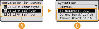 tuşuna basın.![]() <Kopya/Baskı İşi Durumu>İşlenmekte olan, kopyalanmakta olan veya işlenmeyi bekleyen belgelerin bir listesini görüntüler.
