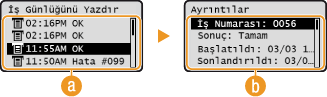 tuşuna basın.![]() <İş Günlüğünü Yazdır>Yazdırılan belgelerin listesini görüntüler. Bir belge başarıyla yazdırıldığında <Tamam> görüntülenir ve bir belge iptal edildiği veya hata oluştuğu için belge yazdırılamadığında <Hata> görüntülenir.
