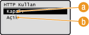 HTTP, Uzak Kullanıcı Arabirimi aracılığıyla makineye erişmeniz gibi durumlarda ağ üzerinden kurulan iletişimler için kullanılır. Bir USB bağlantısı kullanıyorsanız veya HTTP kullanmıyorsanız, kullanılmayan HTTP bağlantı noktası aracılığıyla kötü niyetli üçüncü taraf izinsiz giriş teşebbüslerini engellemek için HTTP'yi devre dışı bırakabilirsiniz.