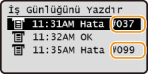 Yazdırma işleminin başarısız olması veya belleğin dolması gibi bir hata oluşursa <Durum Denetleme> ekranında üç haneli bir sayı (hata kodu) görünür. Her bir hata kodunun nedenleri ve çözümleri hakkındaki detaylar için aşağıdakileri bilgileri kontrol edin.