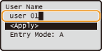 أدخل اسم المستخدم الخاص بك باستخدام المفاتيح الرقمية وحدد <Apply>، واضغط على