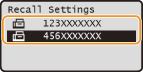 يمكنك تحديد وجهة من بين آخر ثلاث وجهات تم استخدامها. عندما تحدد وجهة مستخدمة سابقًا، يقوم الجهاز أيضًا بضبط نفس إعدادات الفاكس مثل الكثافة التي استخدمتها في آخر مرة أرسلت فيها مستندات إلى هذه الوجهة.