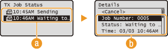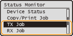 .![]() <TX Job Status>/<RX Job Status>تعرض قائمة المستندات التي يتم إرسالها واستلامها أو قيد المعالجة.