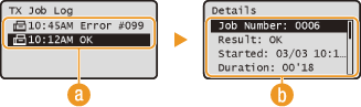 .![]() <TX Job Log>/<RX Job Log>يعرض قائمة من المستندات التي يتم إرسالها واستلامها. يتم عرض <OK> عندما يتم إرسال مستند أو استلامه بنجاح، ويتم عرض <Error> عند فشل إرسال مستند أو استلامه بسبب إلغائه أو لوجود بعض الأخطاء.