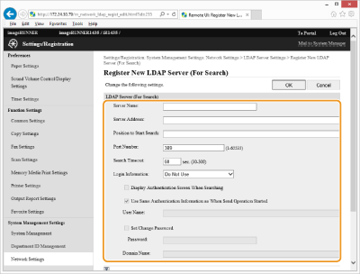 حدد [Do Not Use]، [Use]، أو [Use (Security Authentication)] بحسب نوع المصادقة المنفذة بواسطة الخادم LDAP. عند تحديد [Use] أو [Use (Security Authentication)] يجب تحديد اسم المستخدم وكلمة المرور.