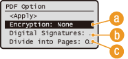 اختر لتحديد الإعدادات لإنشاء ملف PDF مشفر ذي توقيع إلكتروني. بإمكانك أيضًا تحديد إما تقسيم عدة صور إلى ملفات منفصلة عند إرسالها بالبريد الإلكتروني أو تخزينها في خادم ملفات.