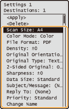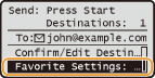 <إعدادات المفضلة> <Edit/Delete> حدد الإعداد عدّل الإعداد <Apply> Yes . لا يمكنك تغيير الوجهات المسجلة في الإعداد باستخدام هذا الإجراء. قم بتسجيل إعداد جديد بالوجهة المطلوبة.إذا كنت تريد حذف الإعداد المُسجل، فاضغط على