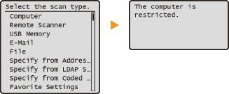 إذا [Scan] تم تحديد مربع الاختيار، فسيتم تعطيل المسح الضوئي للمستندات إلى أجهزة ذاكرة USB ورسائل البريد الإلكتروني وخوادم الملفات. كما يمكنك أيضًا تعطيل المسح الضوئي للمستندات لأجهزة الكمبيوتر عبر <Computer> و<Remote Scanner>. ومع ذلك، يمكنك فقط تعطيل المسح الضوئي للمستندات لأجهزة الكمبيوتر لجميع معرفات الأقسام. (حظر المهام عندما لا يكون معرف القسم معلومًا).