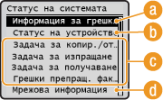 (Екран за състоянието), се извежда екран, чрез който можете да проверите статуса на документи, които се отпечатват, изпращат или получават. Можете също така да проверите статуса на устройството, като например нивото на тонера или настройките на мрежата (например IP адреса на машината).