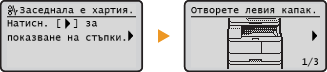 В някои случаи, когато възникне грешка, се извеждат инструкции как да се реагира при тази грешка. Следвайте инструкциите на екрана, за да отстраните проблема. Екранът, който се извежда при засядане на хартия, е показан по-долу (