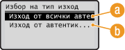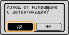 , за да превключите към различна функция от тази, която използвате в момента, се извежда екранът за потвърждение за изход по-долу. За да излезете от функцията "Оторизирано изпращане" (функция за факс или сканиране), използвайте / , за да изберете <Да>, и натиснете .![]() |