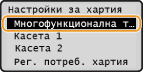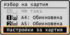 След запаметяване на настройките за хартия по подразбиране, екранът за настройки на хартията не се извежда при зареждане на хартия и винаги се използва една и съща настройка. Ако заредите различен формат или тип хартия, без да променяте настройките за хартията, машината може да не печата правилно. За да избегнете този проблем, забранете настройката по подразбиране, като изберете <Изкл.> на стъпка 3, и след това заредете хартията.