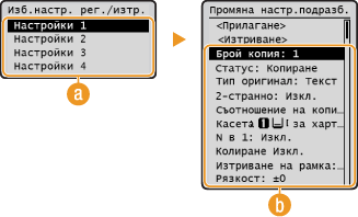 <Предпочитани настройки> <Регистриране/изтриване> изберете настройката редактирайте настройката <Прилагане> <Да> .Ако желаете да изтриете запаметена настройка, натиснете