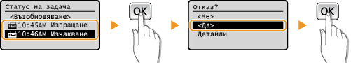 Броят на изпращаните документи, настройките и други детайли се извеждат на екрана. Ако искате само да проверите данните, без да отменяте операцията, натиснете