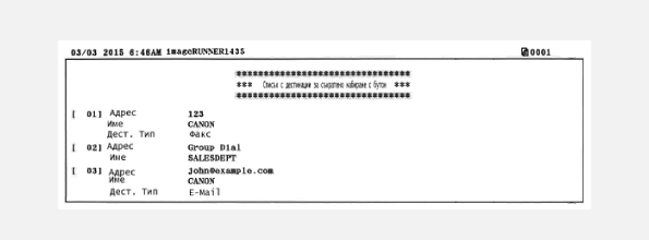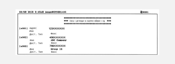 Можете да отпечатате списък, за да прегледате информация за дестинациите, запаметени в адресната книга. Списъци могат да бъдат отпечатвани отделно за типовете <Кодове за съкр. наб.>, <Съкратено набиране> и <Група>.