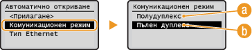 изберете <Полудуплекс> или <Пълен дуплекс> .![]() <Полудуплекс>Редува изпращане и получаване на комуникационни данни. Изберете тази настройка, когато машината е свързана към мрежово устройство чрез полудуплекс.