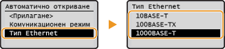 Ethernet е стандарт за обмен на данни в локална мрежа (LAN). Можете да зададете комуникационен режим (полудуплекс/пълен дуплекс) и типа Ethernet (10BASE-T/100BASE-TX/1000BASE-T). В общия случай машината може да се използва, без да променяте настройките по подразбиране (Настройки за Ethernet драйвер), но можете да промените тези настройки в съответствие с мрежовата си среда.