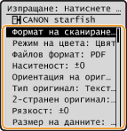Ако изберете JPEG в <Файлов формат>, само една страница може да бъде сканирана, когато документът е поставен върху стъклото на машината. За да сканирате множество документи наведнъж, поставете ги в подаващото устройство. Тези документи ще бъдат сканирани и съхранени в отделни файлове. Ако изберете PDF или TIFF: множество документи могат да бъдат сканирани и съхранени като комбиниран файл, независимо дали документите са поставени върху стъклото на машината, или в подаващото устройство.