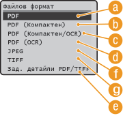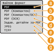 Можете да избирате измежду шест файлови формата, в които да бъдат конвертирани документите. <PDF>, <PDF (Компактен)>, <PDF (Компактен/OCR)>, <PDF (OCR)>, <JPEG> и <TIFF>. Сканираните документи се конвертират в зададения тук файлов формат и след това се изпращат до зададената дестинация.